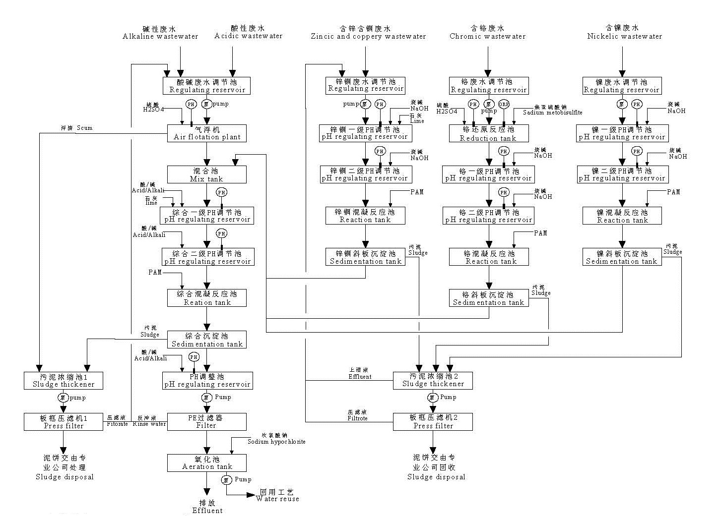 由于重金屬廢水 pH 較低,堿性廢水 pH 較高,因此每種廢水的處理工藝均設置了 pH 調節池。調節 pH 后的廢水進入混凝池與混凝劑反應生成礬花,在沉淀池中得到有效的處理。
