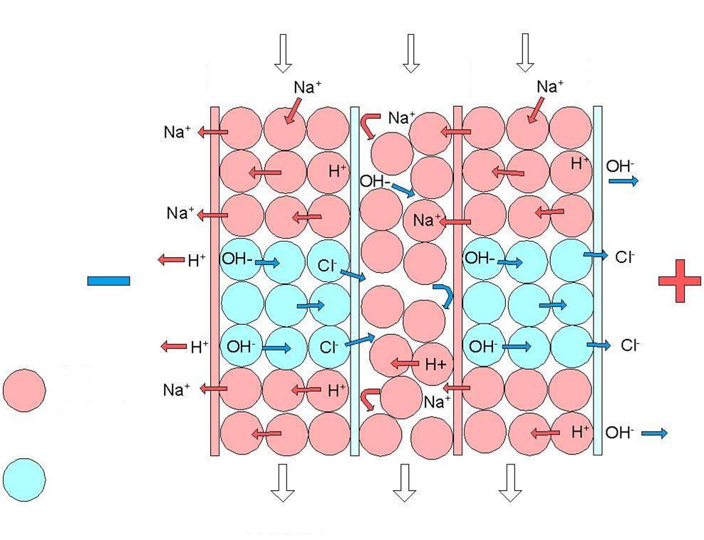 ● 模塊兩端的電極提供了橫向的直流電場(chǎng),電流驅(qū)動(dòng)水中的陽離子(如鈉離子Na+)透過陽離子膜,反之陰離子(如氯離子Cl-)透過陰離子膜,并防止陰陽離子由另一側(cè)濃水室進(jìn)入淡水室(陰離子不能透過陽離子膜,陽離子不能透過陰離子膜),水從離子膜表面流過而不能透過離子膜。陰陽離子從淡水室遷移到濃水室。在此過程可以去除大多數(shù)的強(qiáng)電解質(zhì)物質(zhì),離子交換樹脂起到簡(jiǎn)單的導(dǎo)體作用。